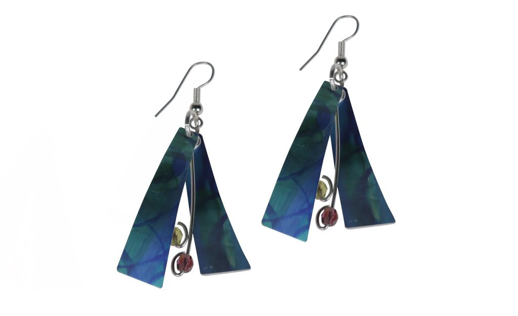 Exclusive patterns enhance these masterfully colored earrings bringing an artistic element to any ensemble. Working with large hand painted images, the artist impresses portions of the original artwork onto the metal, creating one of a kind impressions on each piece. While the colors will be the same as pictured, the painting will be unique to each item. The translucent purple and green gems reflect light, enhancing the overall design.